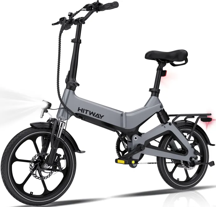 Le vélo électrique pliable de 16 pouces HITWAY est fabriqué en alliage de magnésium et dispose de freins à double disque. Il est réglable en hauteur et de couleur grise. Il est équipé d’une batterie au lithium amovible de 250W 7,5AH / 36V et a une autonomie maximum de 40-45 km. Il est idéal pour une utilisation régulière sur asphalte.